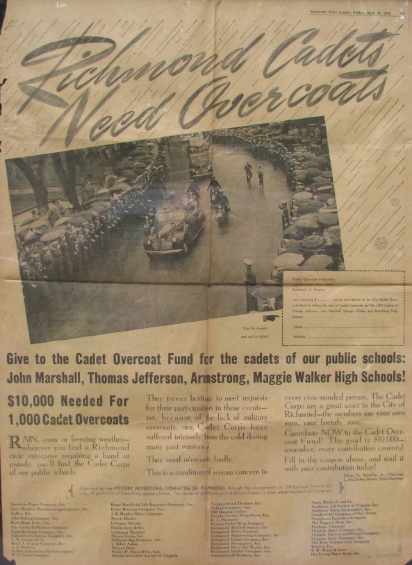 he Richmond News Leader as they promptly announced the newly established Overcoat Fund and agreed to accept and hold all funds. The first formal notice appeared as a letter dated April 8, 1946 (shown at left) and a full page notice followed on April 19. (shown at left, below). The fund was established as a means to acquire coats for all the cadets in the Richmond Public School System with a monetary goal of $10,000. Raising the funds necessary for the procurement of coats became a priority of the newly formed John Marshall Cadet Alumni Association, who were considered the primary sponsor and driving force behind the Cadet Overcoat Fund. The Overcoat Committee was led by Mr. Clyde H. Radcliffe, Jr., Chairman, and Judge L. McCarthy Downs, Vice Chairman. Both were members of the Cadet Alumni Association. In less than one month, on May 15 to be exact, it was announced that the fund had far exceeded the original goal, and that $14,985.48 had been collected.